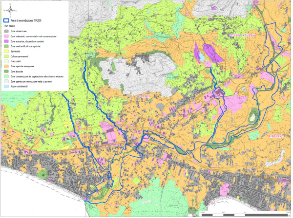 Quest’ultime zone si caratterizzano per la loro distribuzione lineare a sfruttare le vie di comunicazioni principali, nonché ad addensarsi lungo il litorale sia del Comune di Formia (frazione di Gianola), ad Ovest, sia del Comune di Minturno (frazione di Scauri) ad Est. Nelle parti superiori del bacino sono altresì diffuse le colture permanenti, prevalentemente costituiti da alberi di ulivi. Spicca a monte di un affluente, R. Petrosi, in colore fucsia più carico un’area classificata come “attività estrattiva, discarica, cantiere”, ad indicare l’utilizzo che nei tempi recenti è stato praticato.