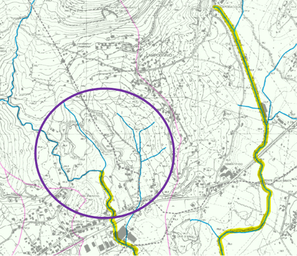 Ubicazione dell’area (circoscritta in cerchio viola) che necessita della bonifica posta a monte del sottobacino dell’affluente del Torrente Pietrosi; all’angolo in alto a destra la sorgente del Rio Capodacqua – Santa Croce